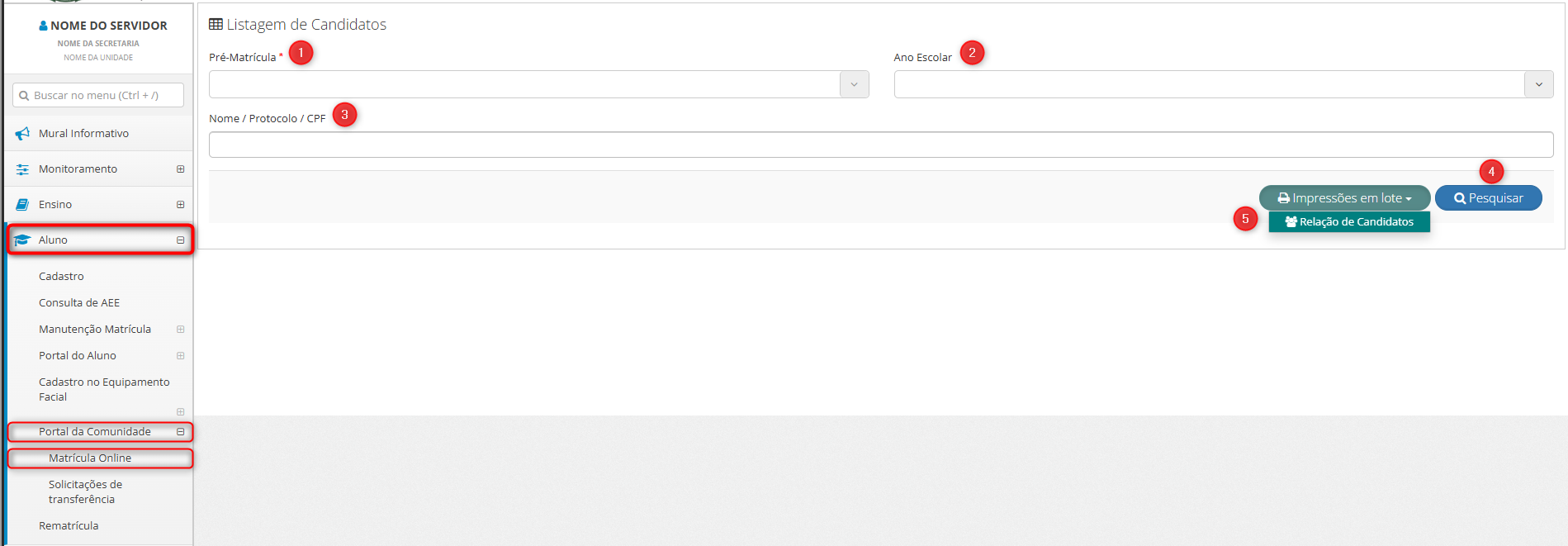 Para realizar esse procedimento, acesse o menu Matrícula Online. Lá você encontrará a lista de candidatos encaminhados e poderá efetivar a matrícula.