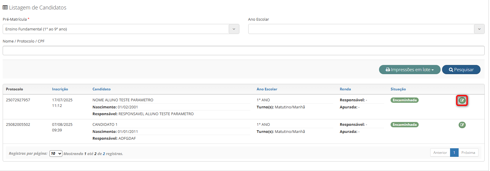 Para matricular o candidato, basta clicar no ícone “Editar”. O sistema redirecionará para o cadastro do candidato, onde será possível visualizar diversas informações, tais como: