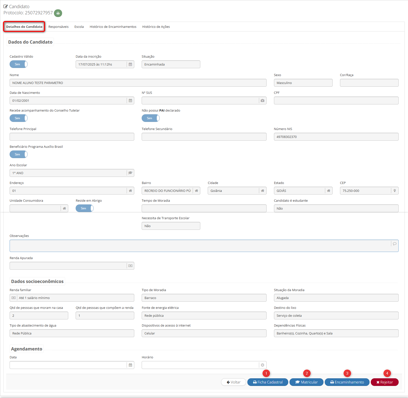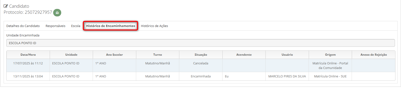 Histórico de Encaminhamentos: Onde serão apresentados todos os encaminhamentos realizados para o candidato.