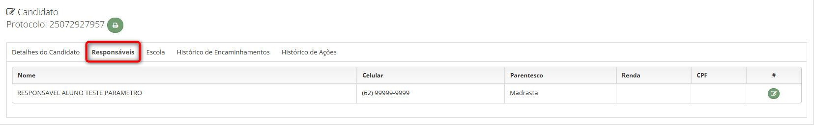 Responsáveis: Onde é possível visualizar algumas informações do responsável, como: nome, celular, telefone fixo, parentesco, sexo, e-mail, data de nascimento, CPF, entre outros.