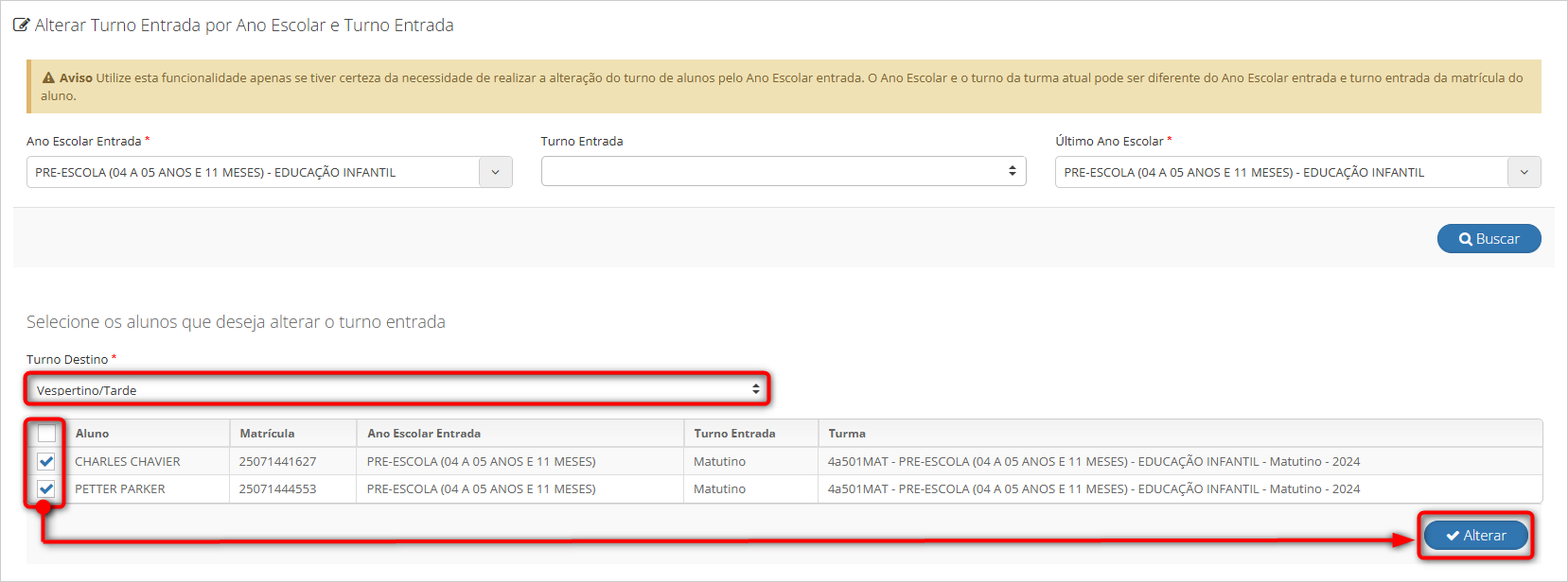 Assim que os anos escolares forem informados, todos os alunos compatíveis serão listados. Basta selecionar os alunos desejados e informar o Turno Destino para o qual será feita a alteração. Após realizar essas seleções, clique no botão “Alterar” para concluir o processo.
