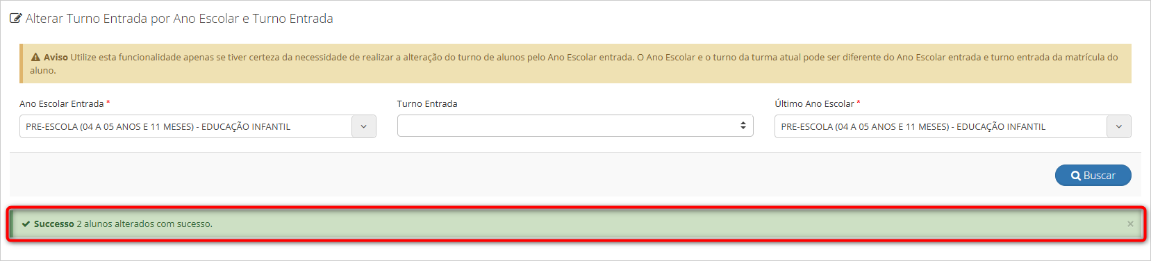 Após clicar no botão “Alterar”, o sistema processará as modificações e apresentará uma mensagem informando a quantidade de alunos alterados com sucesso.