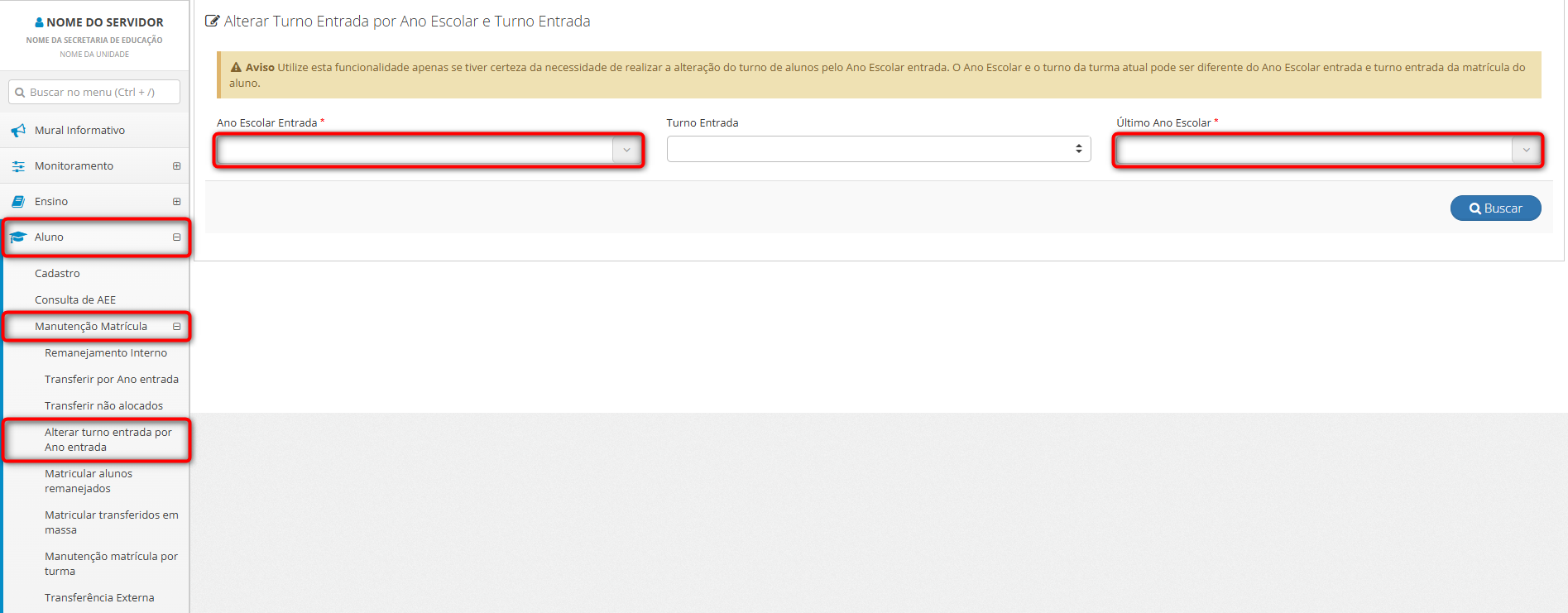 Para alterar o turno dos alunos em lote, é necessário, primeiramente, informar o Ano Escolar Entrada e o Último Ano Escolar dos alunos que deseja processar. Com base nessas informações, o sistema listará automaticamente os alunos correspondentes para seleção.
