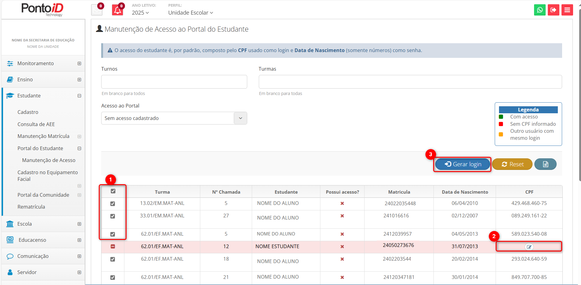É possível gerar o acesso em lote na visão da unidade escolar através do caminho: Estudante > Portal do Estudante > Manutenção de acesso.