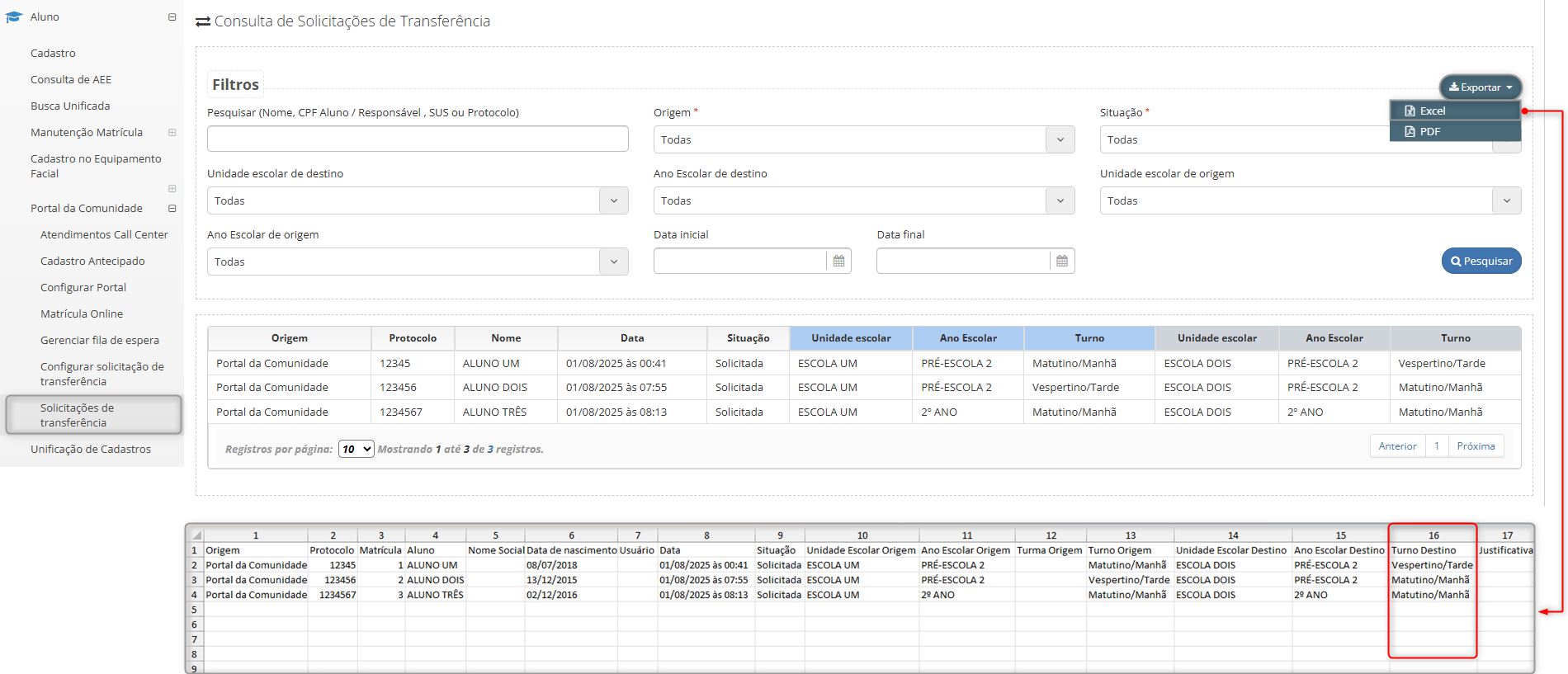 Caminho: Secretaria de educação ou Unidade escolar > Aluno > Portal da comunidade > Solicitações de transferência > Botão: Exportar.