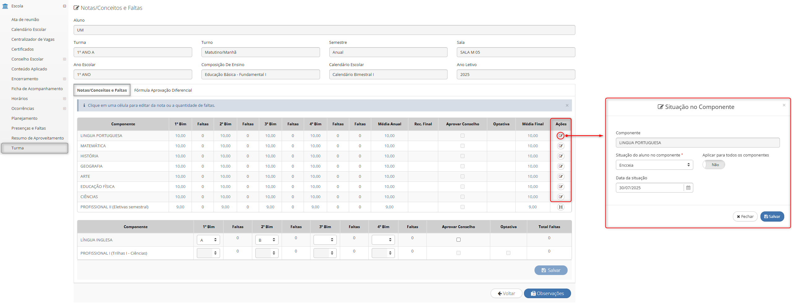 A funcionalidade “Habilitar status do aluno no componente” foi ajustada para garantir que, quando ativada pela secretaria de educação, a informação seja refletida corretamente nas visões da unidade escolar e da diretoria regional, sendo exibida na tela de notas e faltas do aluno, no cadastro da turma.