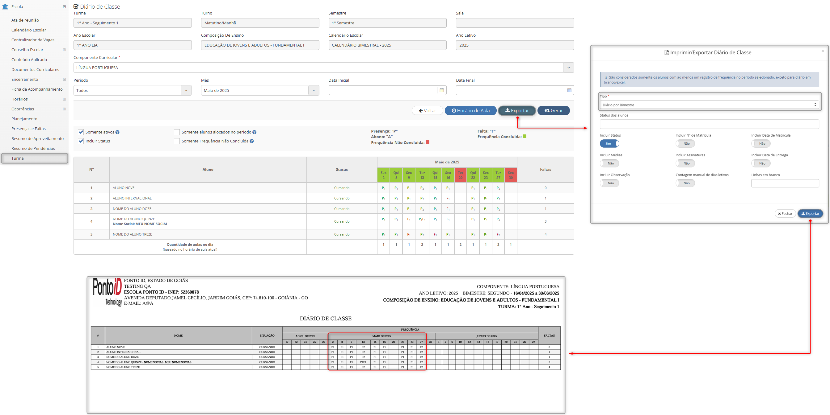 Exportação do diário de classe por bimestre em turmas da modalidade EJA, ajustada para refletir corretamente os dados de frequência registrados no sistema.