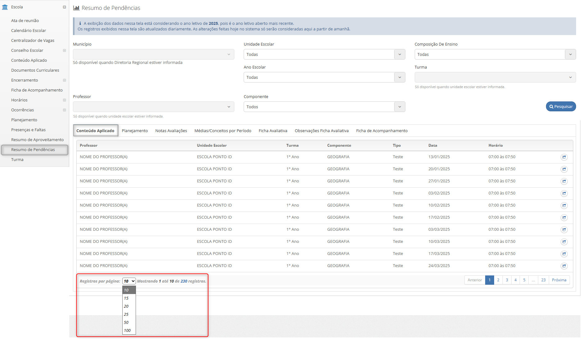Aba de conteúdo aplicado do “Resumo de Pendências”, localizado no módulo “Escola”, atualizada para exibir apenas um seletor de quantidade de resultados, aplicando corretamente a exibição de registros conforme a seleção do usuário.