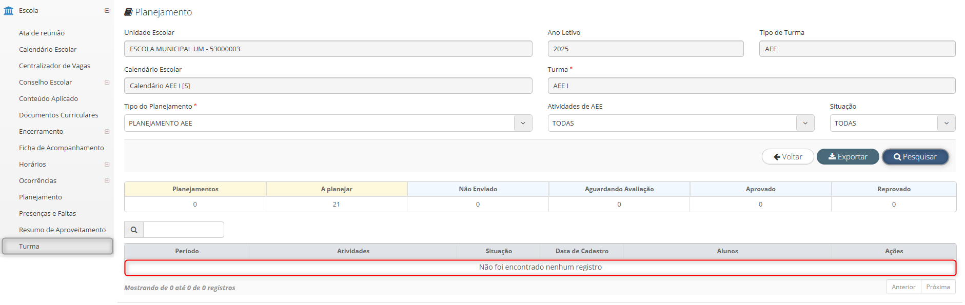 Turmas AEE passam a exibir a mensagem “Não foi encontrado nenhum registro” ao pesquisar planejamentos sem lançamentos.