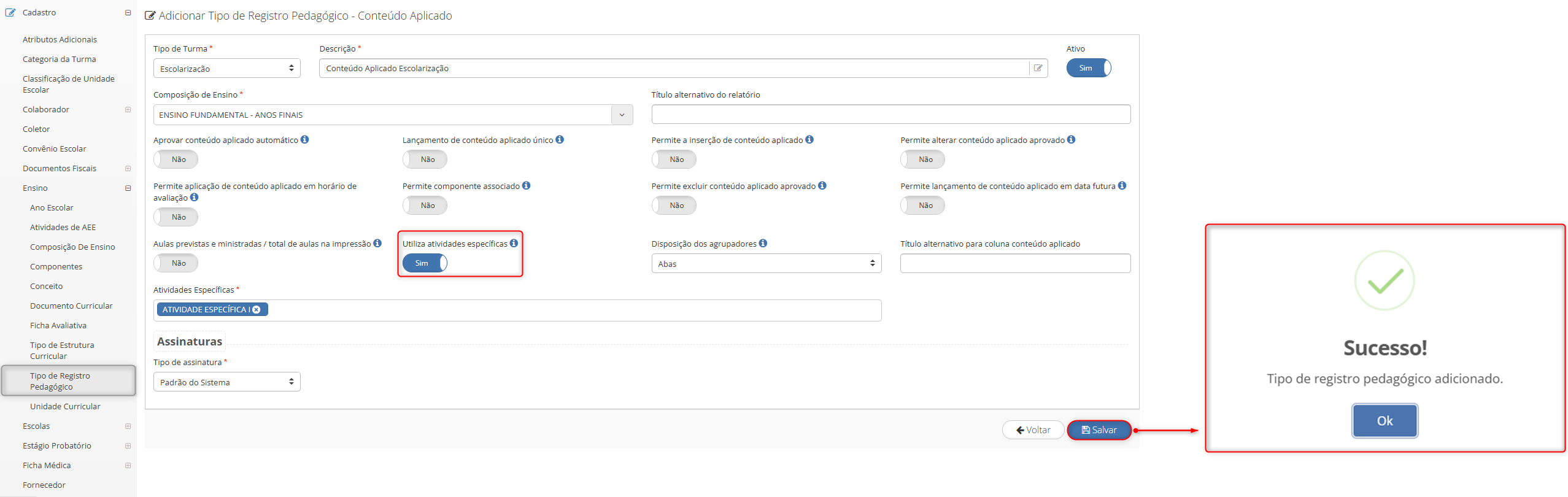 Cadastro de tipo de registro pedagógico de conteúdo aplicado atualizado para permitir a ação de salvar atividades específicas em qualquer tipo de turma, validando corretamente os campos obrigatórios.