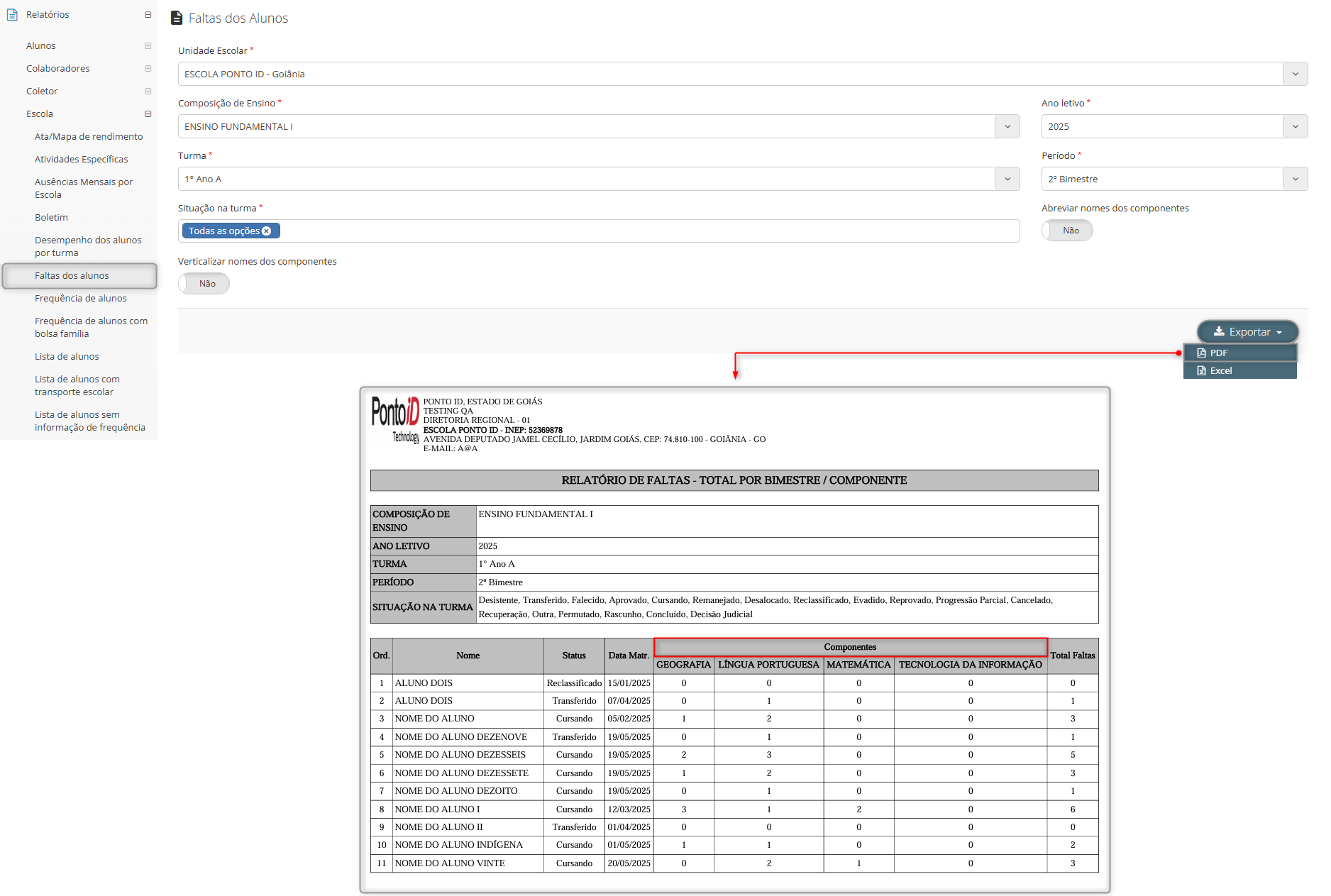 Observação: Componentes marcados como “Diversificada” ou “Atividade complementar”, na configuração dos componentes, não serão considerados na exportação do relatório.