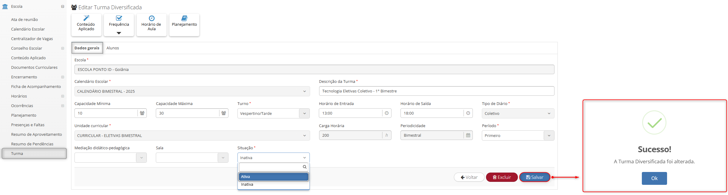 Ajustada a alteração de situação de turmas diversificadas de “Inativa” para “Ativa”. A exibição das turmas inativas também foi normalizada na aplicação do filtro “Inativo” na consulta de turmas do módulo “Escola”.