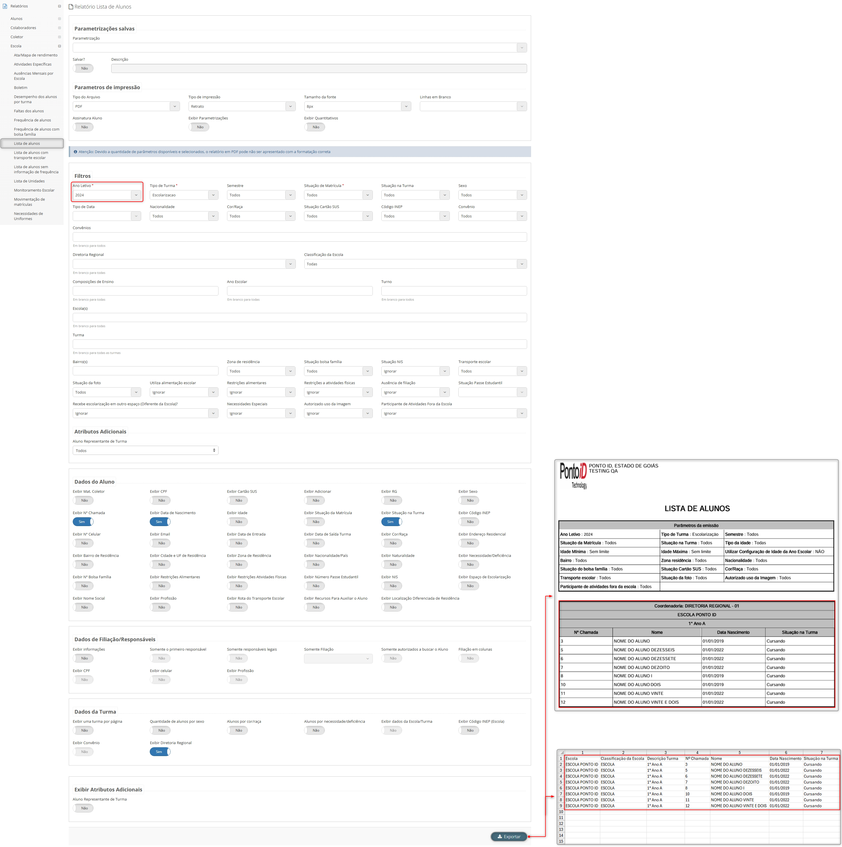 Atributos adicionais configurados passam a ser exibidos nas opções de parametrização do relatório de lista de aluno, podendo ser exportados nos formatos .xlsx e .pdf.