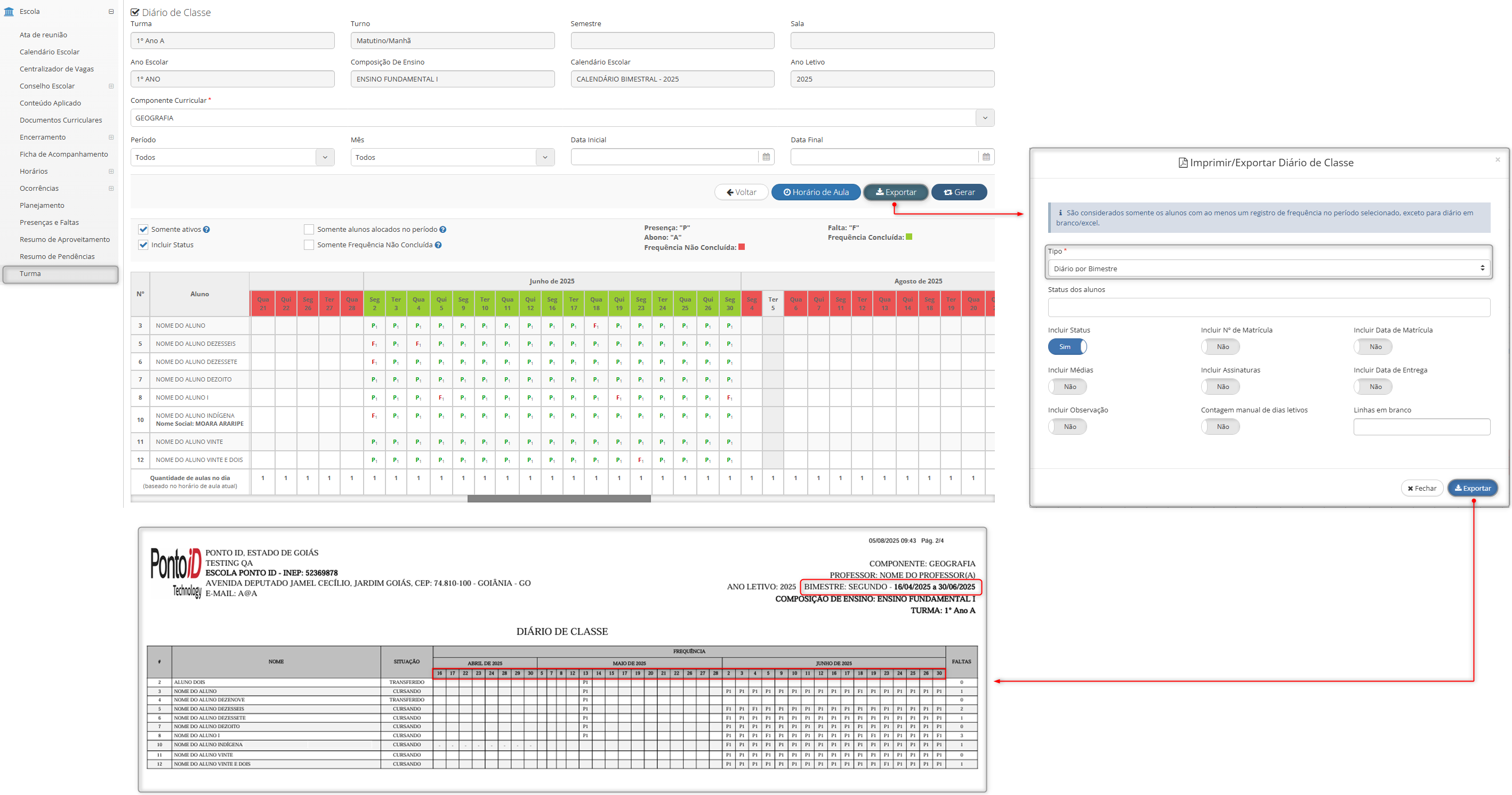 Exportação do diário de classe por bimestre atualizada para exibir corretamente os dias letivos, inclusive dias com horário diferencial, de acordo com o intervalo de datas definido para cada bimestre.