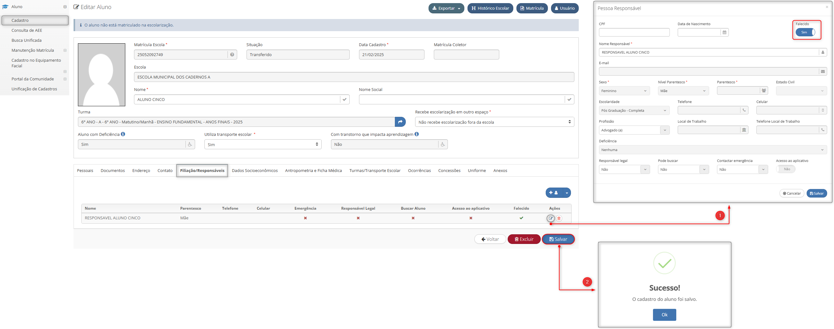 Caminho: Secretaria de educação ou Unidade escolar > Aluno > Cadastro > Selecionar aluno > Aba: “Filiação/Responsáveis” > Editar pessoa responsável> Parâmetro: Falecido ativo > Salvar > Salvar cadastro do aluno.