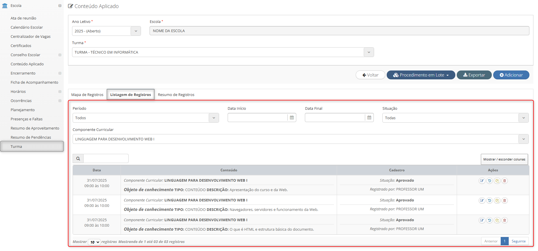 Caminho: Secretaria de educação ou Unidade escolar ou Visão do professor > Escola > Turma > Botão: “Conteúdo aplicado” > Aba: “Listagem de registros”.