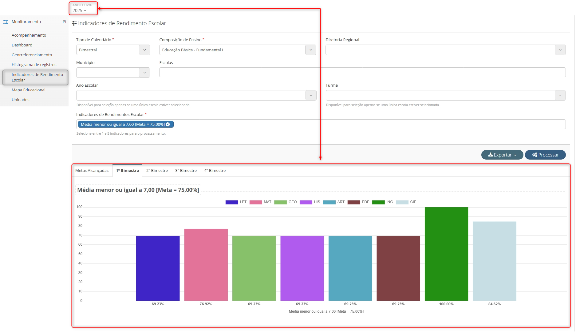 Caminho: Secretaria de educação ou Unidade escolar > Monitoramento > Indicadores de rendimento escolar.