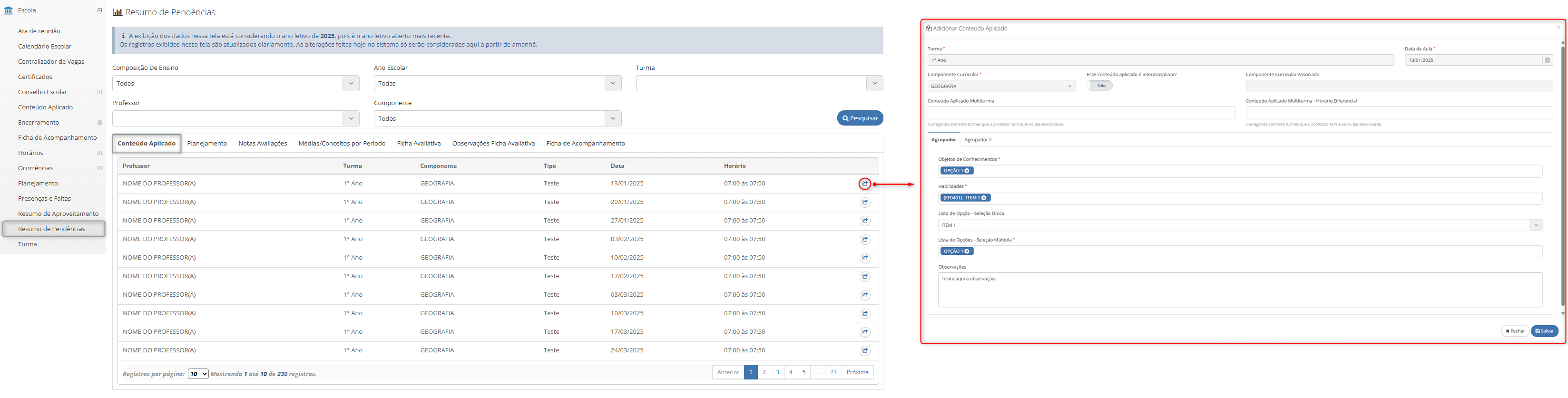 Na aba de conteúdo aplicado do “Resumo de Pendências”, localizado no módulo “Escola”, o botão de redirecionamento para adição de conteúdo aplicado foi atualizado para abrir corretamente o modal correspondente.