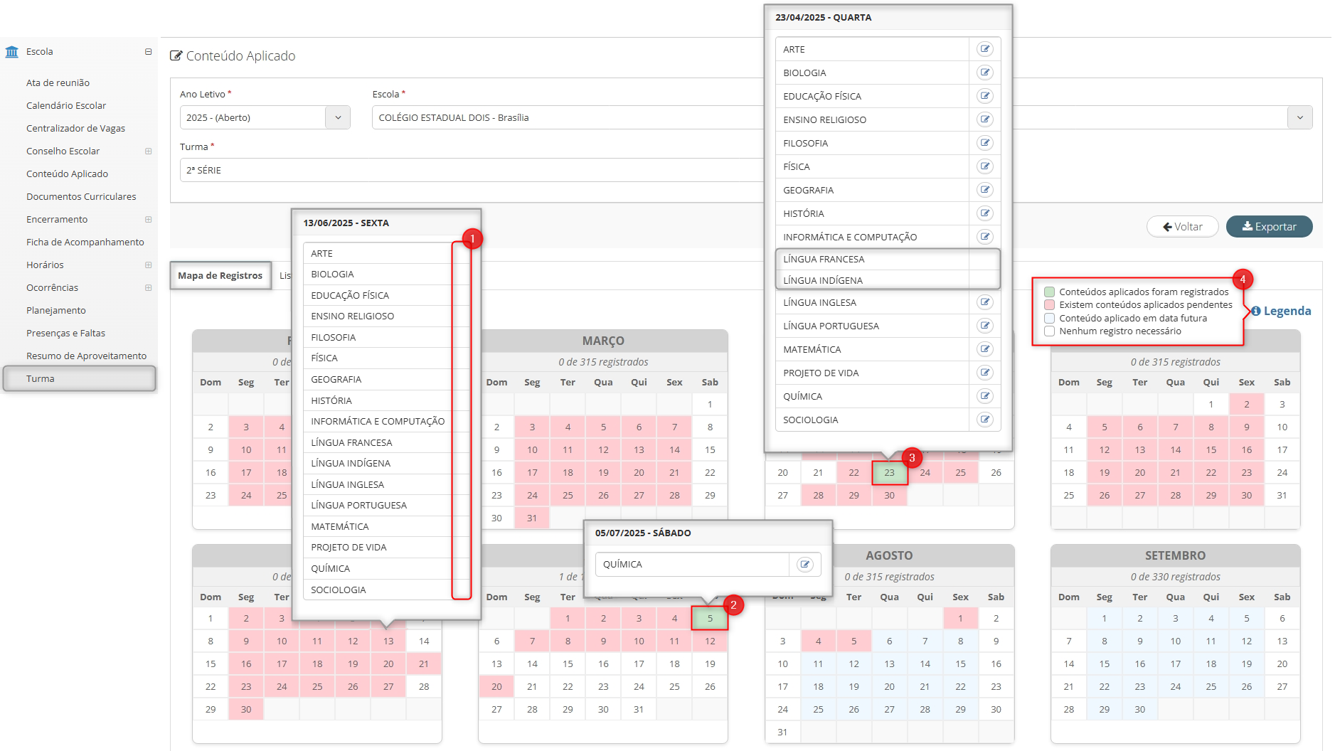 Caminho: Secretaria de educação ou Unidade escolar > Escola > Resumo de pendências > Botão: “Pesquisar” > Aba: "Conteúdo aplicado".