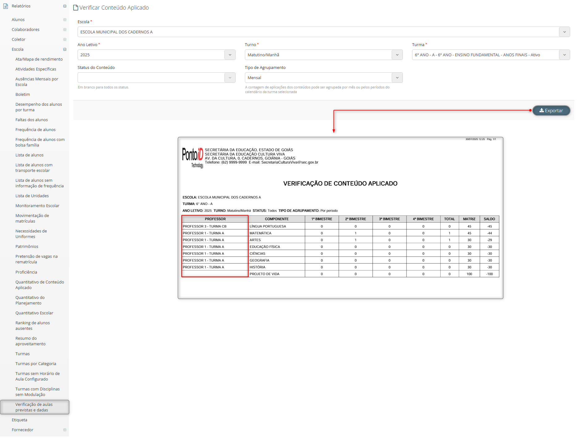 Caminho: Secretaria de educação ou Unidade escolar > Relatórios > Escola > Verificação de aulas previstas e dadas > Botão: “Exportar”.