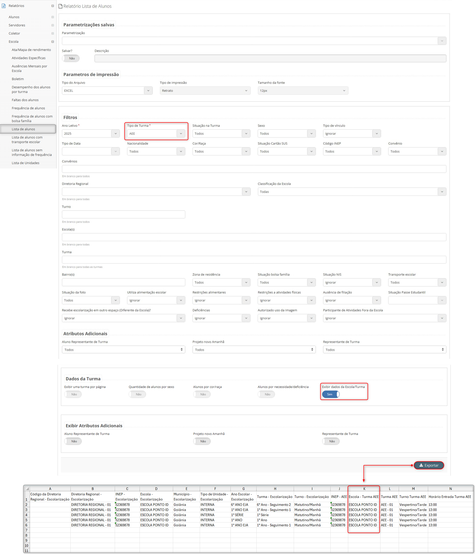 Relatório “Lista de alunos” passa a exibir a unidade educacional da turma AEE na exportação, em formato .xlsx, quando selecionado o tipo de turma AEE.